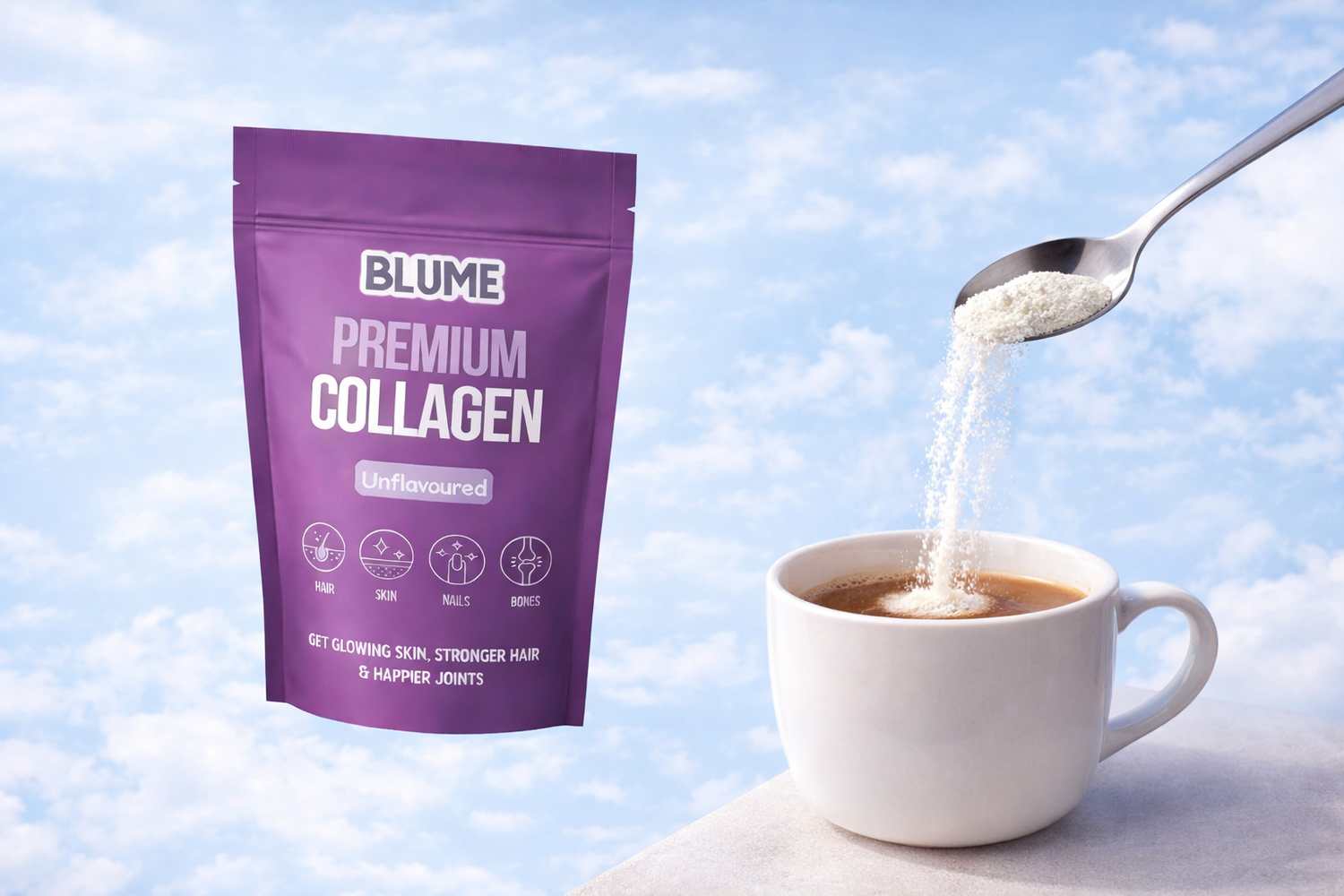 Real support starts deeper. Blume Premium Collagen helps nourish your body from within, supporting healthier skin, stronger hair and nails, and better joint comfort over time.